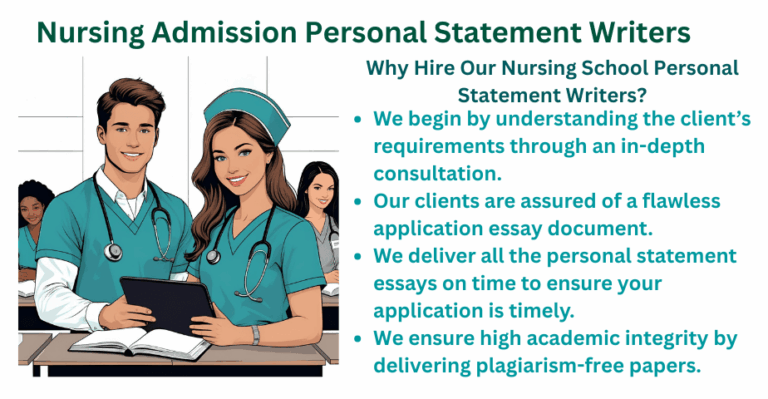 The statement of purpose enables the nursing school’s admission committee to evaluate the student’s career aspirations, professional contributions, goals, subject proficiency, and motivation for pursuing the nursing program. The statement of purpose typically consists of (a) personal background, (b) academic details, (c) professional experiences, (d) short and long-term goals, (e) reasons for selecting the nursing school, and (f) interests and hobbies. For professional statement of purpose writing help, hire our skilled writers for professional statements of purpose that will improve your acceptance rates.