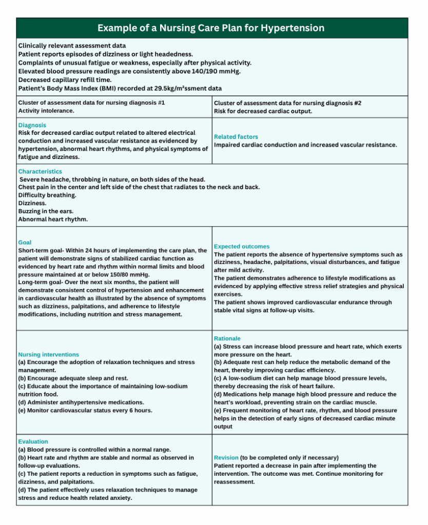 Evaluation encompasses collecting data and comparing it with desired outcomes, analyzing the patient’s response, identifying factors that enabled the success or failure of the care plan, adjusting the plan, and planning for future nursing care. When writing the evaluation, the nurse uses subjective and objective information from the patient to assess their progress. Based on the results, the nurse determines whether the interventions are effective in meeting the patients’ needs, and if there is a positive advancement, the care plan may continue. However, if the patient’s needs are not being met, modification to the care plan is made.